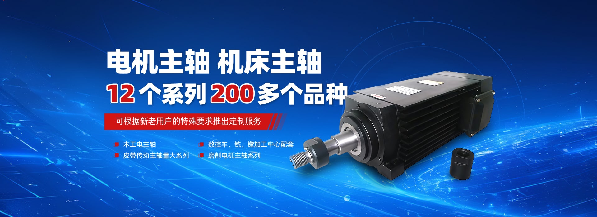 擁有現(xiàn)代化的電機(jī)主軸、機(jī)床主軸設(shè)計(jì)和制造技術(shù)、設(shè)備精良,品質(zhì)可靠。產(chǎn)品有四大類(lèi)12個(gè)系列200多個(gè)品種,主要適用于數(shù)控加工,高速內(nèi)外圓磨削、高速鉆銑及雕刻、木工鏤銑等。數(shù)控機(jī)床主軸包括電動(dòng)主軸、皮帶傳動(dòng)主軸量大系列與數(shù)控車(chē)、銑、鏜加工配套。